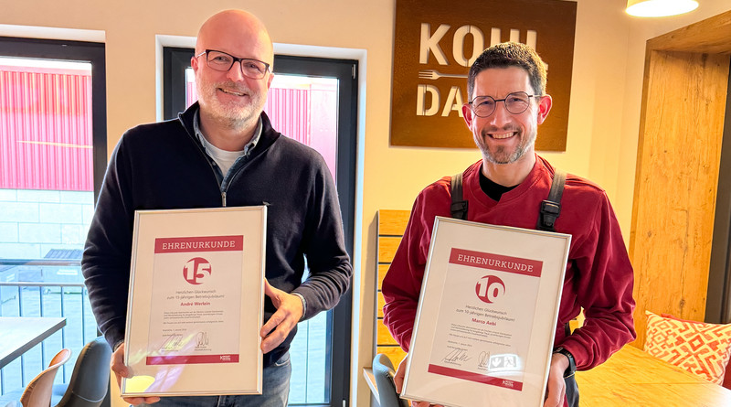 Lieber André, lieber Marco, wir gratulieren euch herzlich zu eurem Betriebsjubiläum und danken euch für eure Treue und euren Einsatz über so viele Jahre. Wir freuen uns schon auf viele weitere Jahre mit euch!