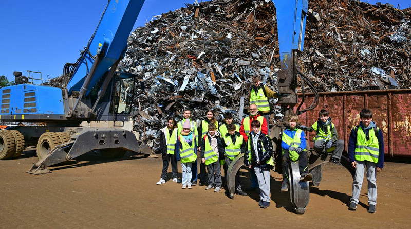 Nach einer kurzen Einführung und Vorstellungsrunde ging es direkt los: Die Jugendlichen durften wechselweise unsere Mitarbeiter verschiedener Bereiche begleiten und sie bei ihrer Tätigkeit unterstützen. Im Wareneingang haben die Jugendlichen die Vorgänge bei der Befundung eingehender Materialien begleitet und das beeindruckende Zusammenspiel von anliefernden LKWs, Baggern, Radladern und Aufbereitungsanlagen kennengelernt. Ein weiteres Highlight war die Arbeit auf unserer stationären Schrottschere mit 1000t-Scherkraft. Mit voller Aufmerksamkeit und Motivation konnten die Kids die große Anlage bereits nach kurzer Einweisung fast selbständig bedienen. Strahlende Augen gab es auch beim näheren Kennenlernen unserer Bagger und Radlader, bei denen die Jugendlichen auch mal selbst Greifer und Schaufel bedienen und ihr Feingefühl unter Beweis stellen konnten.